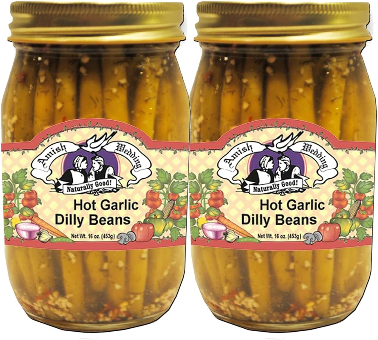 Amish Wedding Foods Pickled Garlic Dilly Beans, 2-Pack 16 oz. Jars (Hot Garlic)
